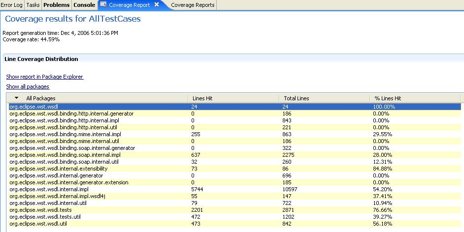 Here's a sample report produced on the component I'm primarily working on - the WSDL EMF model. As my component lead said when he saw it, it seems we've got some holes here and there... :-)