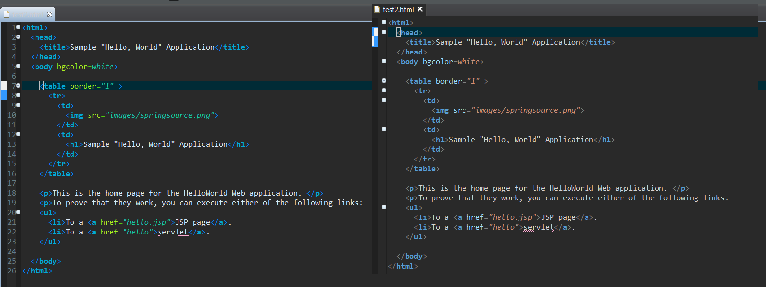 2) IMHO, text editor coloration should be improved. For instance I think the use of green for attribute value is not very good. I have quickly changed the CSS for HTML editor (it looks like to VSCode) and here the result (on the left, the old dark theme, on the right the new dark theme). If you like it I could create a PR for that.