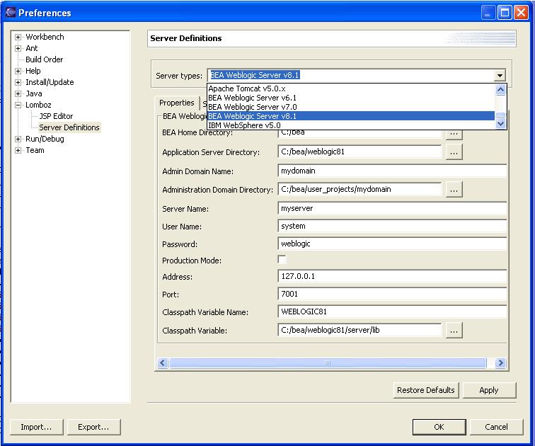 Server ToolsOne of the most popular features in Lomboz is the handling of application server definitions. This feature allows people to enter their own server defintions and not be limited with the list of servers that are packaged with Lomboz. Server definitions are XML-based descriptors which can be defined for runtimes from different vendors, different versions of servers from the same vendor, or different configurations of the same server for different applications. The following sample Figure 1: Server Configuration Editor
